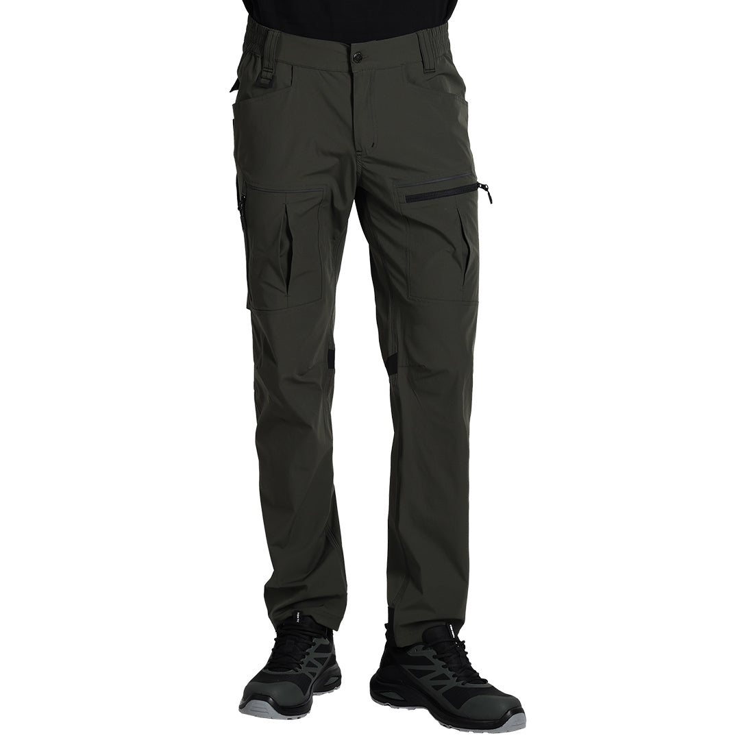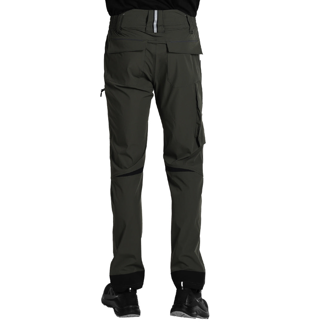 Elastične radne pantalone od 4-way stretch najlona, 260 g/m², sa produženim pojasom na zadnjoj strani, ojačanjima na kolenima i zadnjem delu nogavica. Dva prednja džepa, dva zadnja džepa sa preklopom, dva multifunkcionalna džepa na nogavicama, trostruki štepovi kao ojačanje, reflektivni detalji..