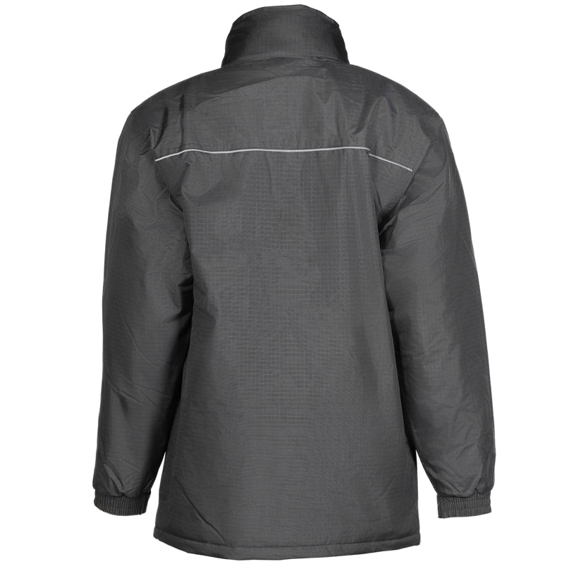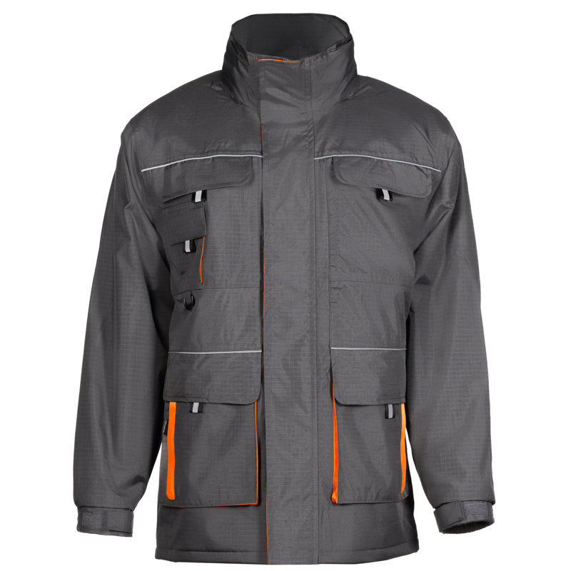 Postavljena kišna jakna sa kapuljačom. Izrađena od veoma inovativnog ripstop materijala od 100% poliestera sa PVC premazom.Ključne karakteristike su vodootpornost i izdržljivost. Funkcionalni džepovi, mandžetne se podešavaju sa čičak trakom.