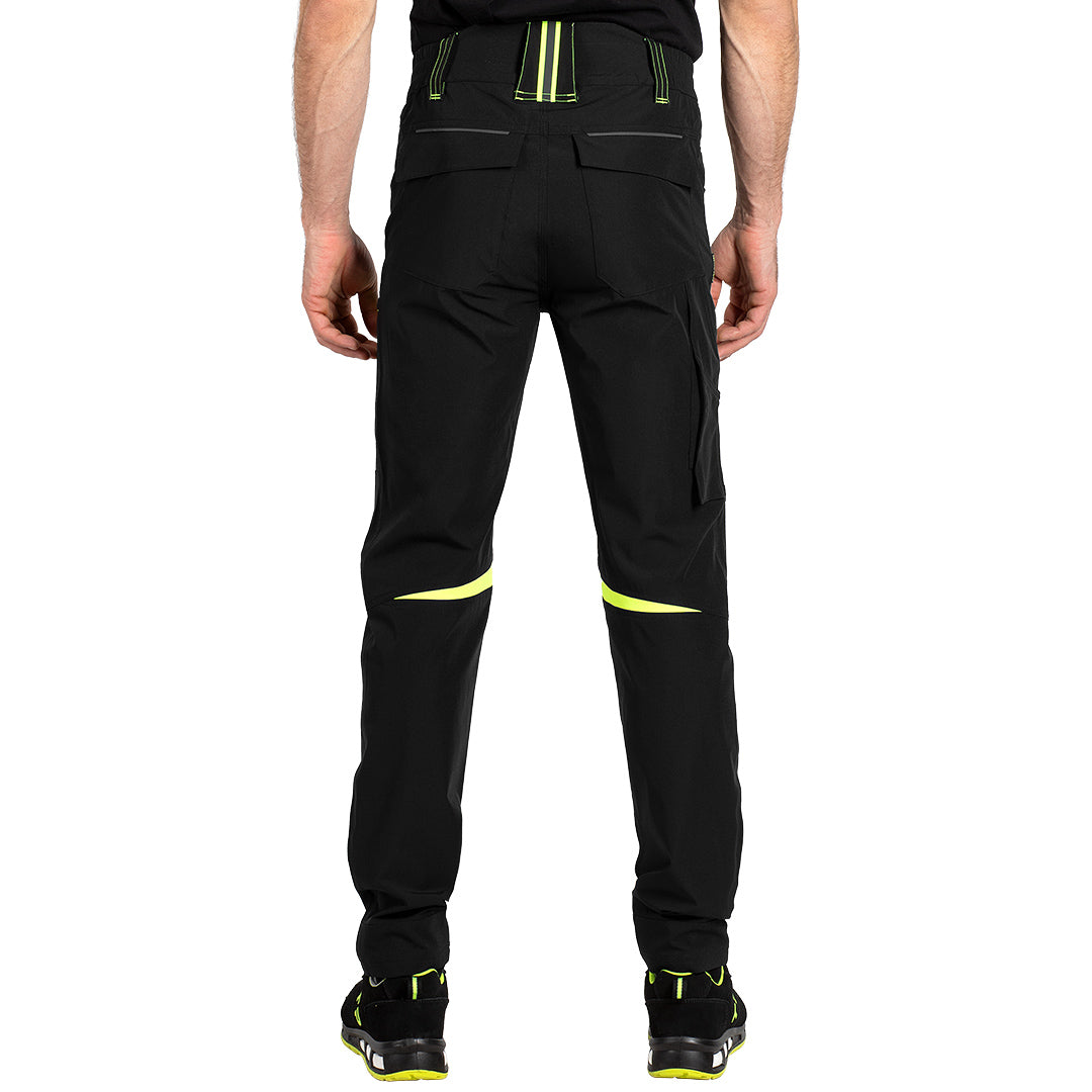 Elastične radne pantalone od 4-way stretch najlona, 260 g/m², sa produženim pojasom na zadnjoj strani, ojačanjima na kolenima i zadnjem delu nogavica. Dva prednja džepa, dva zadnja džepa sa preklopom, dva multifunkcionalna džepa na nogavicama, trostruki štepovi kao ojačanje, reflektivni detalji..