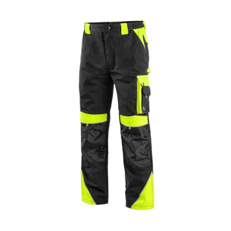 Muške radne pantalone,sa kopčanjem u struku , sa dodatom gumom sa strane.Prednji džepovi su sa umetkom, a sa obe strane su multifunkcionalni džepovi. U predeo kolena je ubačeno ojačanje od poliester 600D materijala, ostavljeni su otvori za mogućnost umetanja štitnika za kolena. Na dva zadnja džepa su dodati reflektujući dodaci.